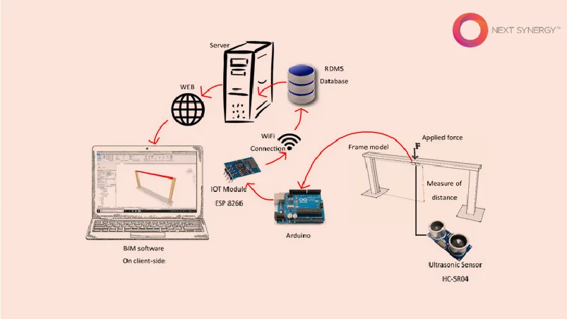 An ultrasonic sensor was applied to a structural element modelled in 3D through BIM software running on a remote, network-connected computer.